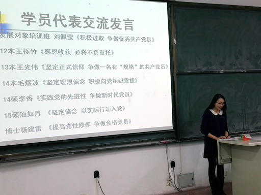 之后,发展对象培训班管委会主席腾继良和积极分子培训班管委会副主席孙郅闳分别代表2015秋发展对象培训班、入党积极分子培训班学员管委会,向学院分党校汇报两个培训班管委会的工作情况,并与大家分享了近一个多月学习及工作等方面的心得体会。各年级学员代表也在会上交流了学习感言。发展对象培训班14本刘佩莹《积极进取争做优秀共产党员》;入党积极分子培训班12本王栎竹《感恩收获必将不负重托》、13本王光伟《坚定政治信仰争做一名有“规格”的共产党员》、14本毛煜波《坚定理想信念积极向党组织靠拢》、14硕李香《实践党的先进性争做新时代党员》、15硕油如月《坚定信念以实际行动入党》以及博士生杨建雷《提高党性修养争做合格党员》都真实地表达了他们在此次培训班学习的深切感受。学员们纷纷表示,短期的培训学习虽然结束了,但是他们在今后的学习、生活、工作中,将始终坚持以党员的标准要求自己,努力提高自身的思想政治素养和党性修养,以实际行动争取早日加入党组织!