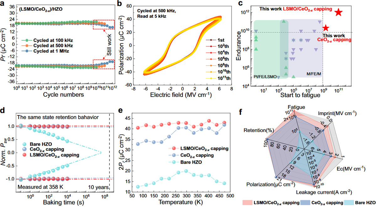 针对上述问题,陈祖煌教授团队创造性地构建了氧化铈/铪锆氧化物(CeO2-x/HZO)共格异质界面,利用氧化铈(CeO2-x)的多价态特性实现氧空位的动态调控,抑制界面处的铁电-顺电相变,突破传统铪基铁电器件的疲劳瓶颈。研究团队首次揭示了氧缺陷定向迁移对铪基铁电器件可靠性的重要影响。团队通过构建对称电极的界面设计降低内建电场,从而抑制缺陷定向移动,提升循环稳定性。基于这一双重防护机制,在保证器件完全翻转的前提下,铪基铁电器件实现了1011次的无疲劳翻转(极化损失<5%)和1012次的稳定循环(未击穿),且循环过程无需编程再生和热处理复活,这突破了铪基铁电器件的可靠性极限。同时,通过优化的铪基铁电器件兼具高极化、低矫顽场、低漏电流和优异温度稳定性,是集成全性能的“六边形战士”型铁电器件。